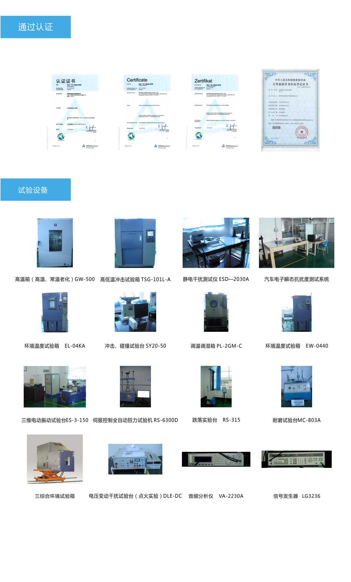 本着“顾客满意”的目标,公司一直以来不断完善检验、检测设备,确保产品在研发阶段和生产阶段均能满足客户需求。公司现已建成环境测试、机械性能测试、电气性能测试、耐久性测试四个试验室,同时光学性能试验室也在筹划中,计划在2019年投入使用。