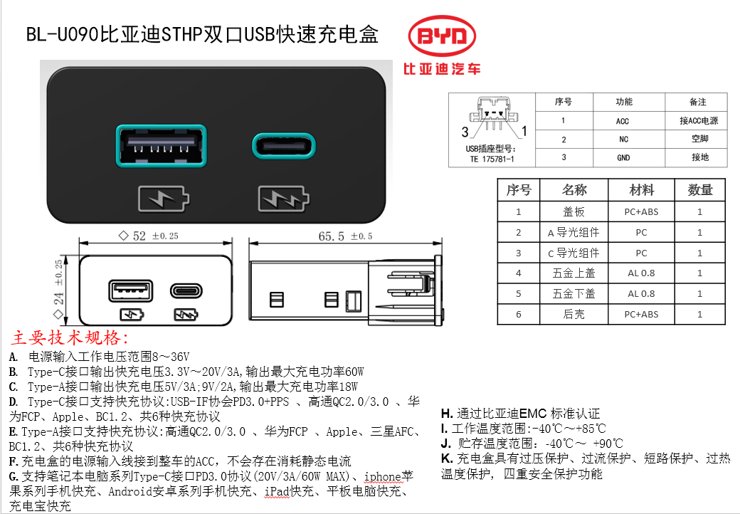 E.Type-A接口支持快充协议:高通QC2.0/3.0 、华为FCP 、Apple、三星AFC、 BC1.2、共6种快充协议