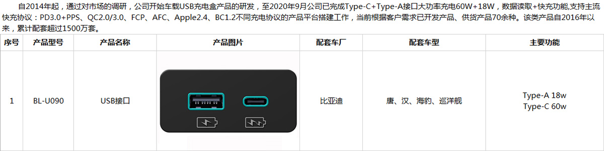 自2014年起,通过对市场的调研,公司开始车载USB充电盒产品的研发,至2020年9月公司已完成Type-C+Type-A接口大功率充电60W+18W,数据读取+快充功能,支持主流快充协议:PD3.0+PPS、QC2.0/3.0、FCP、AFC、Apple2.4、BC1.2不同充电协议...